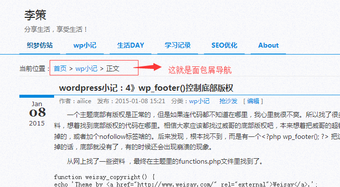 面包屑导航一般出现在列表页也就是栏目页和内容页,最好出现在显而易见的地方。关于代码如何去实现,我想应该不难。